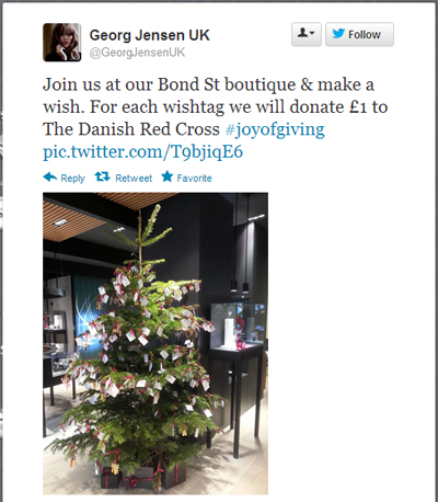 Danish brand Georg Jensen is asking consumers to stop by its new Bond Street location in London to tie a wish to the in-store Christmas tree which will fuel a donation to the Danish Red Cross.
