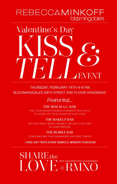 The brand is pushing attendees to purchase a Mini M.A.C. bag to go with their Valentine’s Day evening outfit at the Kiss & Tell event. Rebecca Minkoff invited New Yorkers to Bloomingdale’s today from 4-6 p.m. via Facebook, email and direct consumer outreach from the department store.