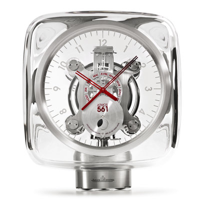 The capsule collection included Jaeger-LeCoultre’s Atmos 561 clock designed by Marc Newson. The Atmos clock created for and auctioned at Sotheby’s was updated to include red accents and is cased in a Baccarat crystal case.