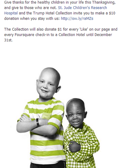 Fans who visit the Trump Hotel's social media pages are introduced to the Thanks and Giving campaign through cover photos. For every like that accrues on the collection's Facebook page through Dec. 31, $1 will be donated to St. Jude. Also, every four-square check-in to a property during this time will elicit $1.