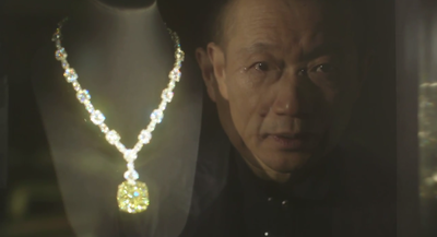 Next, the camera shows the Tiffany Diamond in its display case alongside Mr. Dun’s reflection. The next scene fades to a Tiffany blue and features both Mandarin and English subtitles that describe the relationship between composer, jeweler and diamond.