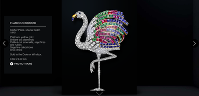 Further down, a selection of Cartier pieces included in the exhibit can be viewed such as a flamingo brooch commissioned by the Duke of Windsor.