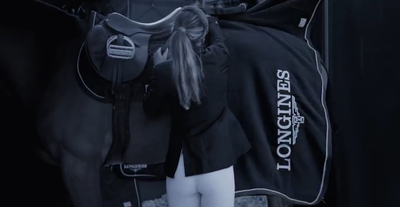 As the horse is prepared for its event, the video slightly pauses when Ms. Richard’s wristwatch is shown. To complete the horse’s show dressings, Ms. Richard places a Longines blanket on its back.