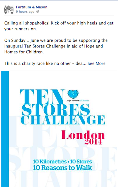 “The Ten Stores Challenge charity event is a perfect fit for Fortnum & Mason, as it combines an important cause with the theater of social shopping, which is in line with the whole Normcore footwear fashion phenomena,” said Ken Morris, principal at Boston Retail Partners, Boston.