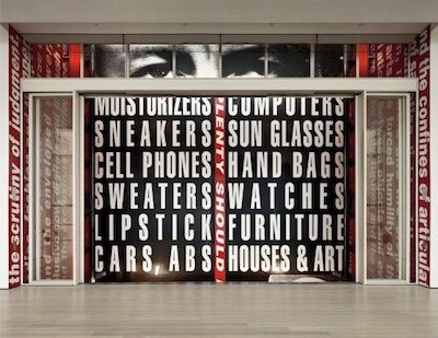 A lot of Ms. Kruger’s work takes text and pairs it with images to create an ironic statement. At LACMA, the artist has a three-story digital-print installation, “Shafted,” within the elevator shaft.