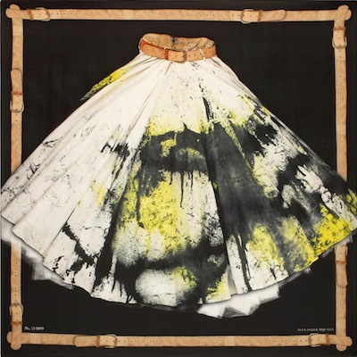 The five 100 percent silk scarves created to celebrate Savage Beauty’s opening at the Victoria & Albert Museum (see story) feature a print of an iconic piece from Mr. McQueen’s most memorable collections.