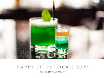 Peninsula focused on the other side of St. Patrick’s Day with an image of different appropriately colored drinks. Bally created a collage of different green products that can be worn on March 17.