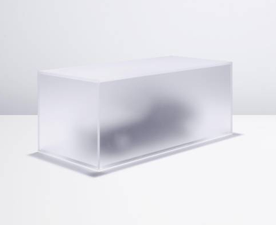 "The block has been drilled 16 times, in a very orderly and simple grid pattern. Fourteen drill holes pass through the clear set resin only, two pass through the resin and the model car. It is a sculptural piece which looks very simple, but with an underlying reference to the huge numbers of people who are touched by breast cancer in the UK each year."